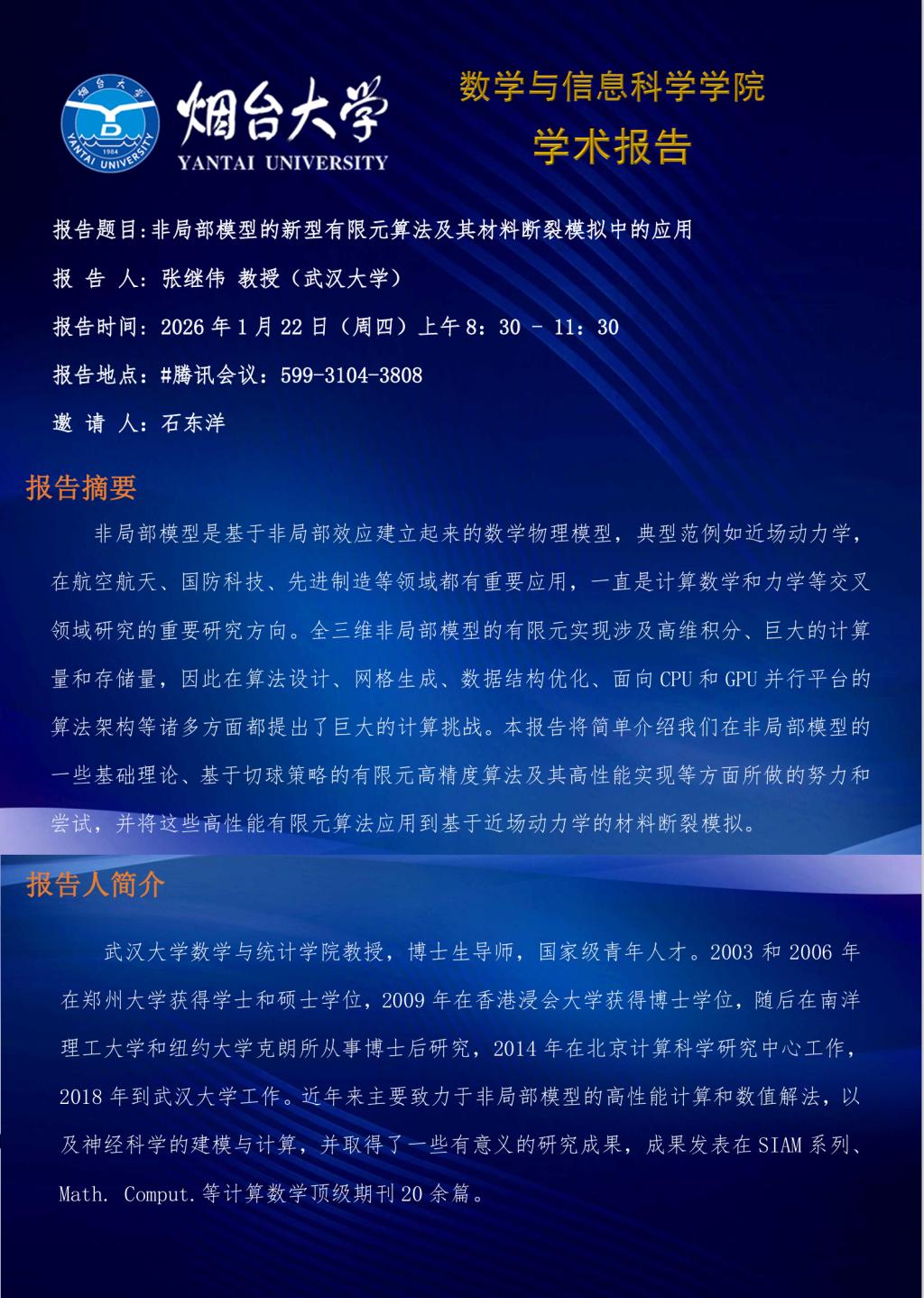 学术报告—张继伟 教授(武汉大学)—20260122